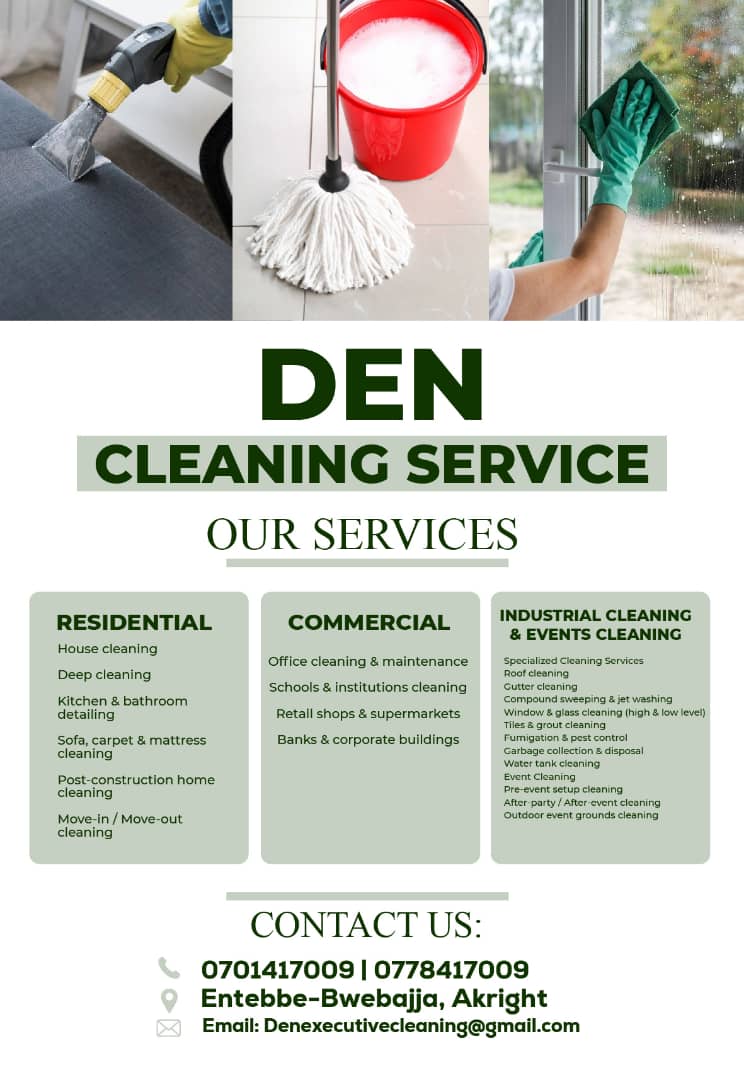 Den Executive Cleaning And Mitigation Consult, established in 2015, is a leading cleaning and mitigation company in Uganda. They provide top-notch services to residential, commercial, and industrial clients, consistently delivering exceptional results.